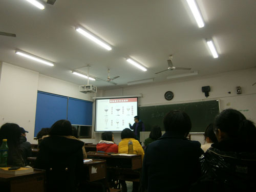 12月17日晚上7时,纳新首席讲师、逸香葡萄酒教育初级讲师庞翊瑜首次做客湖南财经大学讲堂,为10级营销班的学生开讲了“ESW初级课程”。庞翊瑜老师采用文化与生活、讲述与演示相结合的授课方式阐述了葡萄酒的栽培和葡萄酒酿造技术、葡萄酒的品尝方法和礼仪,从而推广葡萄酒文化,普及葡萄酒知识,提高学生日后的社交技能等有很重大的意义。此次课程不仅可以提高大学生的文化素养,更有利于推动葡萄酒消费与鉴赏,普及葡萄酒文化。