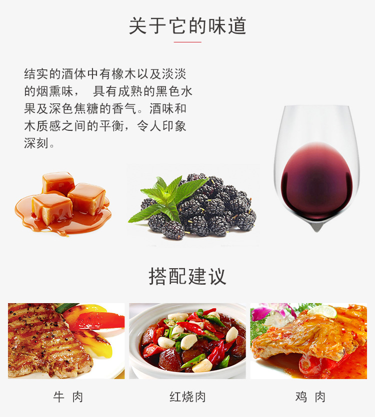 此款采用坦普拉尼洛和赤霞珠混合酿制, 结实的酒体中有橡木以及淡淡的烟熏味, 具有成熟的黑色水果及深色焦糖的香气。 酒味和木质感之间的平衡,令人印象深刻。 适合搭配红烧肉、牛排、鸡、鸭等肉类菜肴。